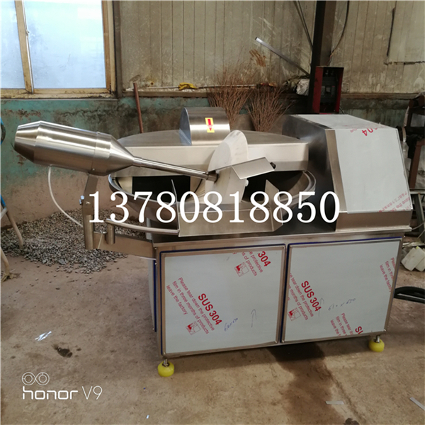 Chopping machine knife speed, pot speed, chopping knife and turn the pot gap to achieve the appropriate combination, so that the cutting product fineness is good, small temperature rise, cutting mixing time is short, especially because of emulsification treatment, so that the intestinal products of fine density and elasticity greatly enhanced, greatly improved the emulsification effect of meat products, elasticity and fineness. The chopping machine uses the cutting knife high-speed rotation cutting effect, the meat and auxiliary materials cut into meat or meat mud, can also be auxiliary materials, borneol, water and meat or meat together to stir evenly. Frequency conversion technology is adopted to adjust the tool speed in a wide range, with the function of energy saving. The tool speed, pot speed, the gap between the cutter and the pot, the material and the hardness of the cutter are designed reasonably. The whole machine adopts SUS304 stainless steel plate, reasonable structure, beautiful, easy to clean. ① This machine is widely used in meat, vegetables, nuts, seafood and condiments. (2) The pan is made of cast stainless steel, and there is an anti-overflow pot edge to effectively prevent the phenomenon of material seepage. The key parts are processed by machining machines to ensure the machining accuracy. ④ The cutting tool is made of imported materials by special process, and imported cutting tools can also be selected. The spindle adopts imported double bearing series installation mode to ensure good concentricity of cutter shaft group.
