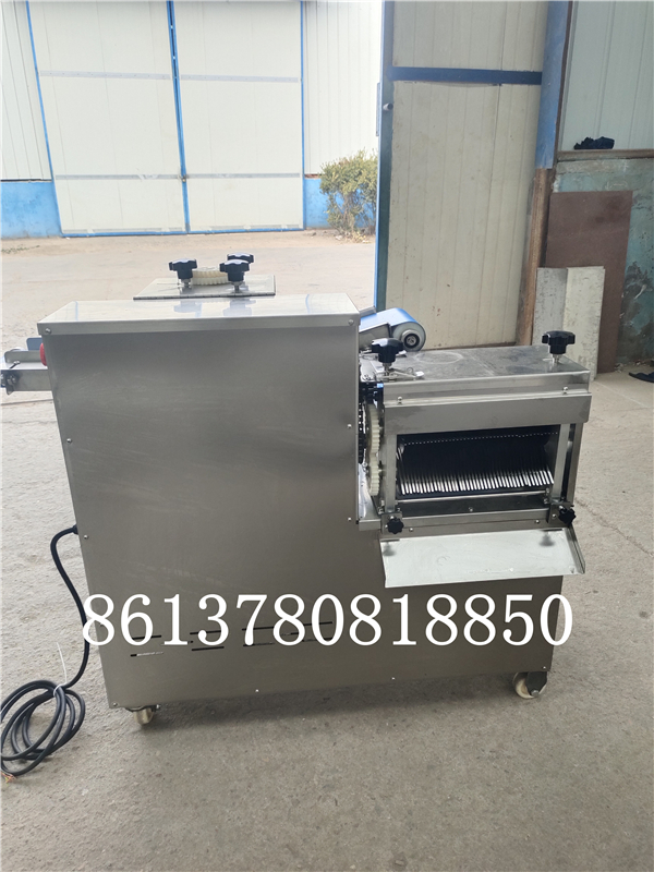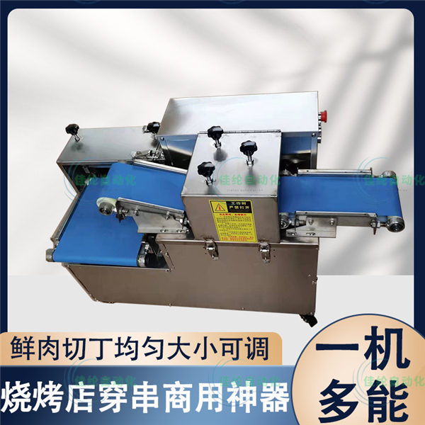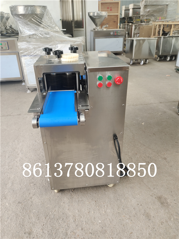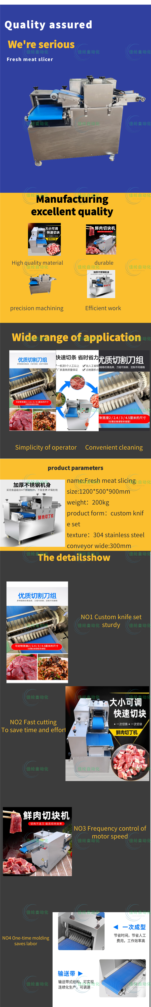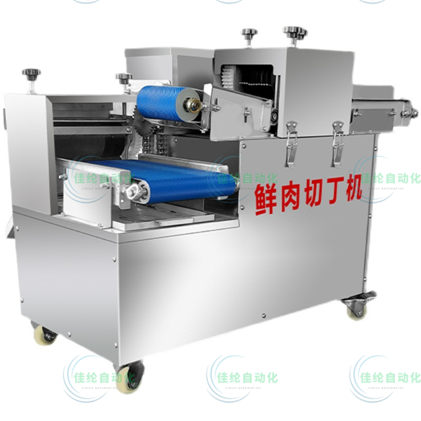 The whole machine is made of stainless steel with beautiful appearance. This dicing machine can cut fresh meat and semi-defrosted meat into cuboids and cubes of different sizes and shapes according to customer needs. The freshly baked tofu can be cut into cubes and cuboids of different sizes and shapes. This dicing machine can also be processed into strips, slices, silk shapes. The size of the cut is adjustable. Sliced meat, shredded, diced in the same size. Can be processed into 3 to 100 mm long pieces, d, bar, silk and other shapes.
