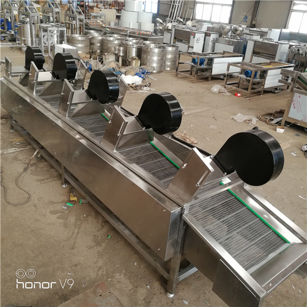 本机适用于灭菌后的高低温肉制品、蔬菜制品等软包装产品灭菌后的除水工作,亦适用于蔬菜清洗后表面水的去除。通过多次翻身沥水,及上部高压强冷风吹,使软包装完全达到表面水珠吹干的效果(袋面皱纹间的存水也能干)。此设备与杀菌机相连并速度同步,每台风机功率:0.75KW,设备环保节能。